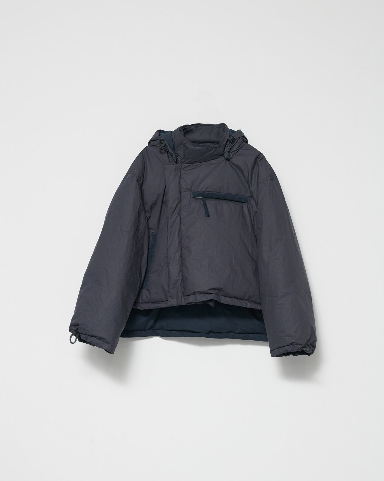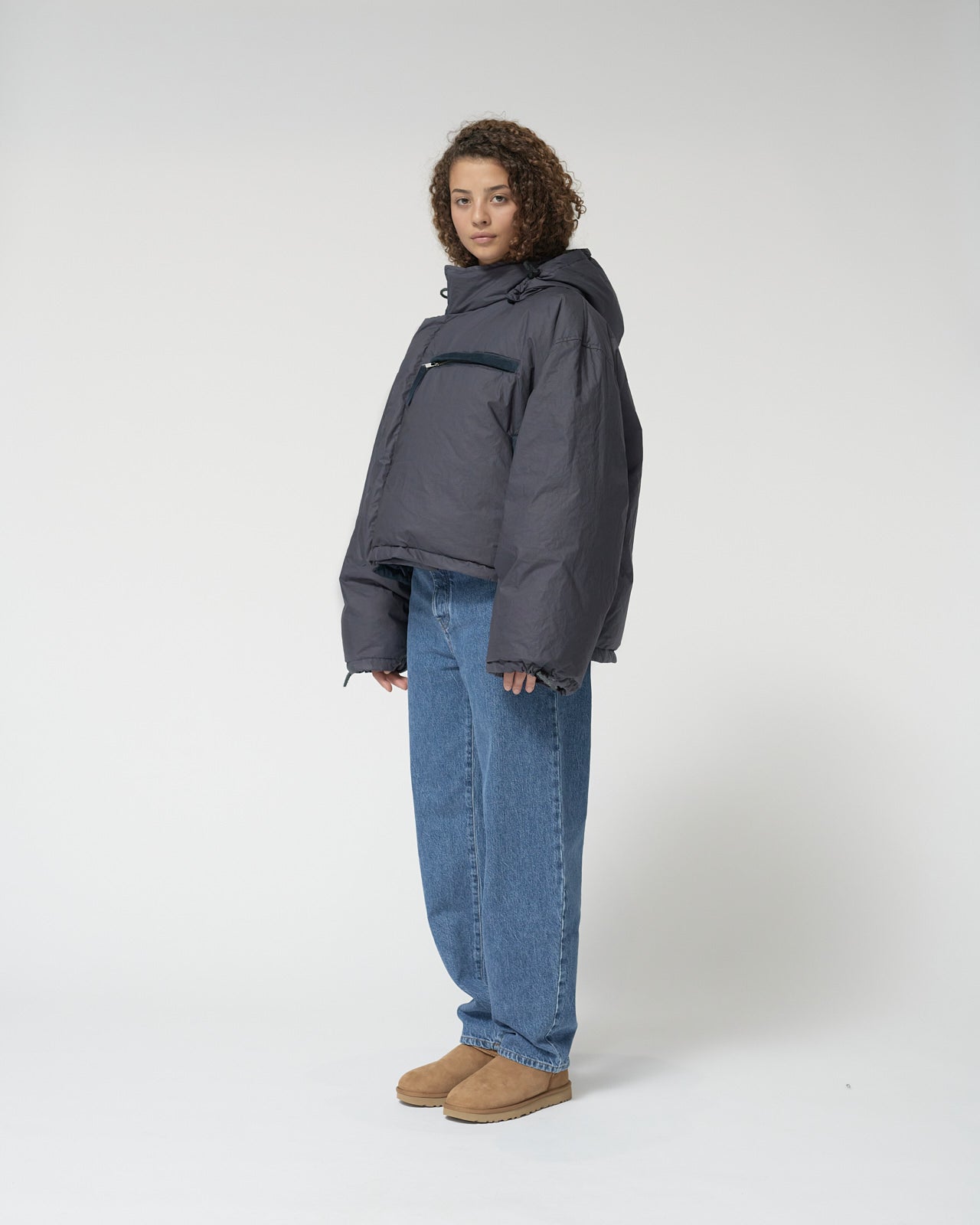 Re:Down water repellent cotton poplin puffer jacket. The puffer coat has a removable hood and an asymmetrical zip and button closure. Suede pockets and drawstrings in hood and sleeves. Corduroy detail on hood and sleeves. The jacket is 10 cm longer in the back than the front.