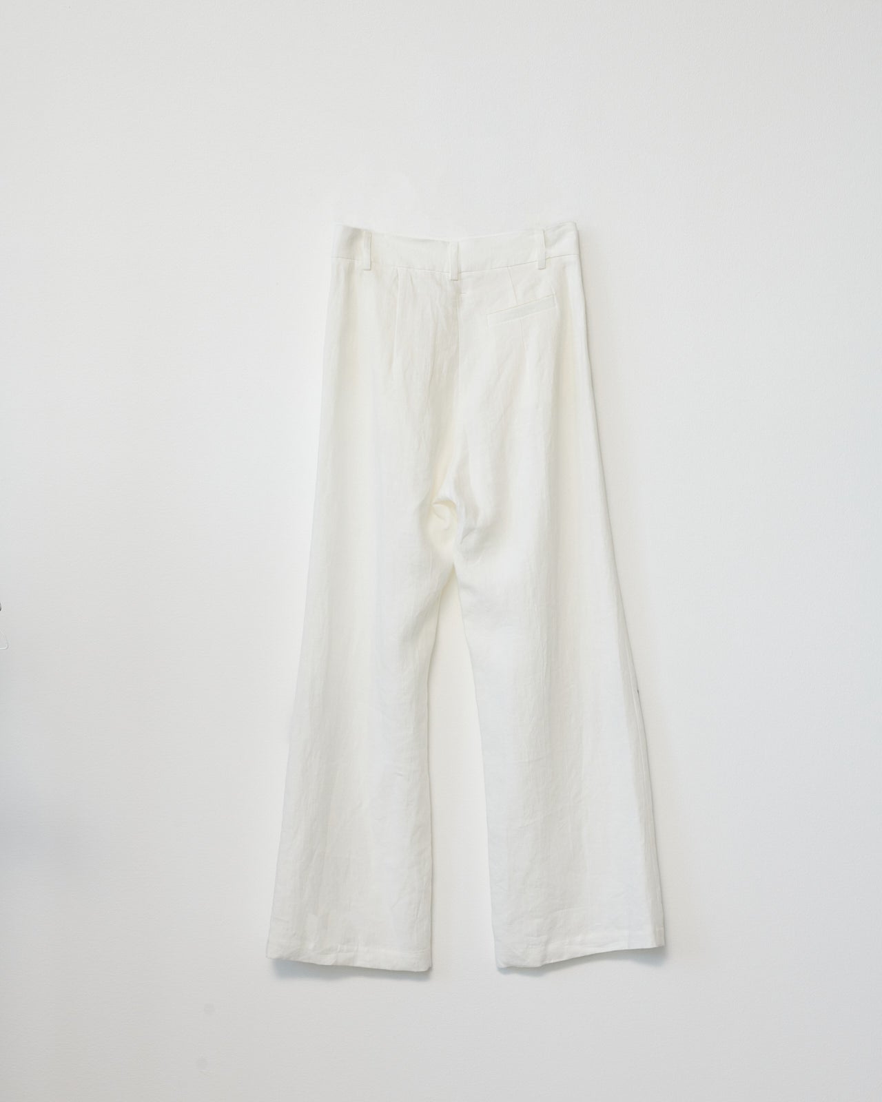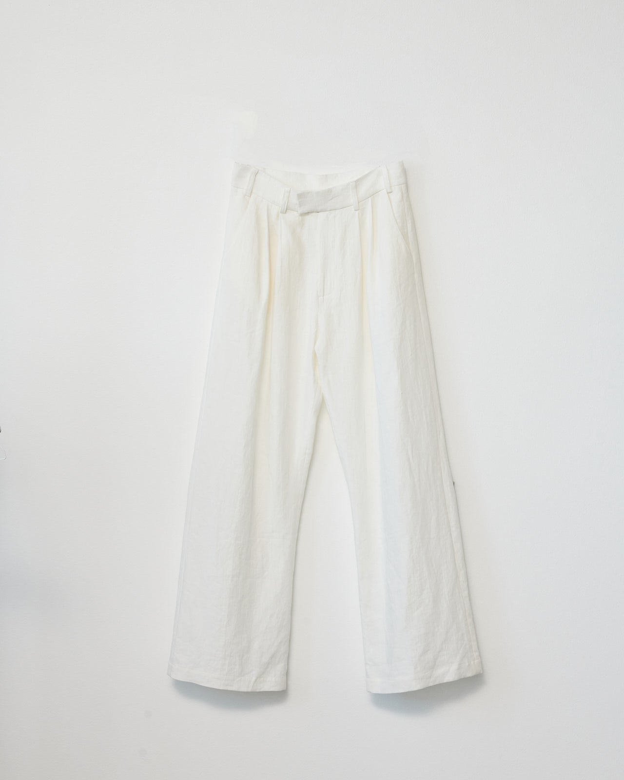 Oversized natural linen box trousers with an added pleat in each leg for a wider silhouette. Designed with two side pockets, one jetted back pocket, and a concealed hook-and-eye, horn button, and zip closure. Inspired by menswear.