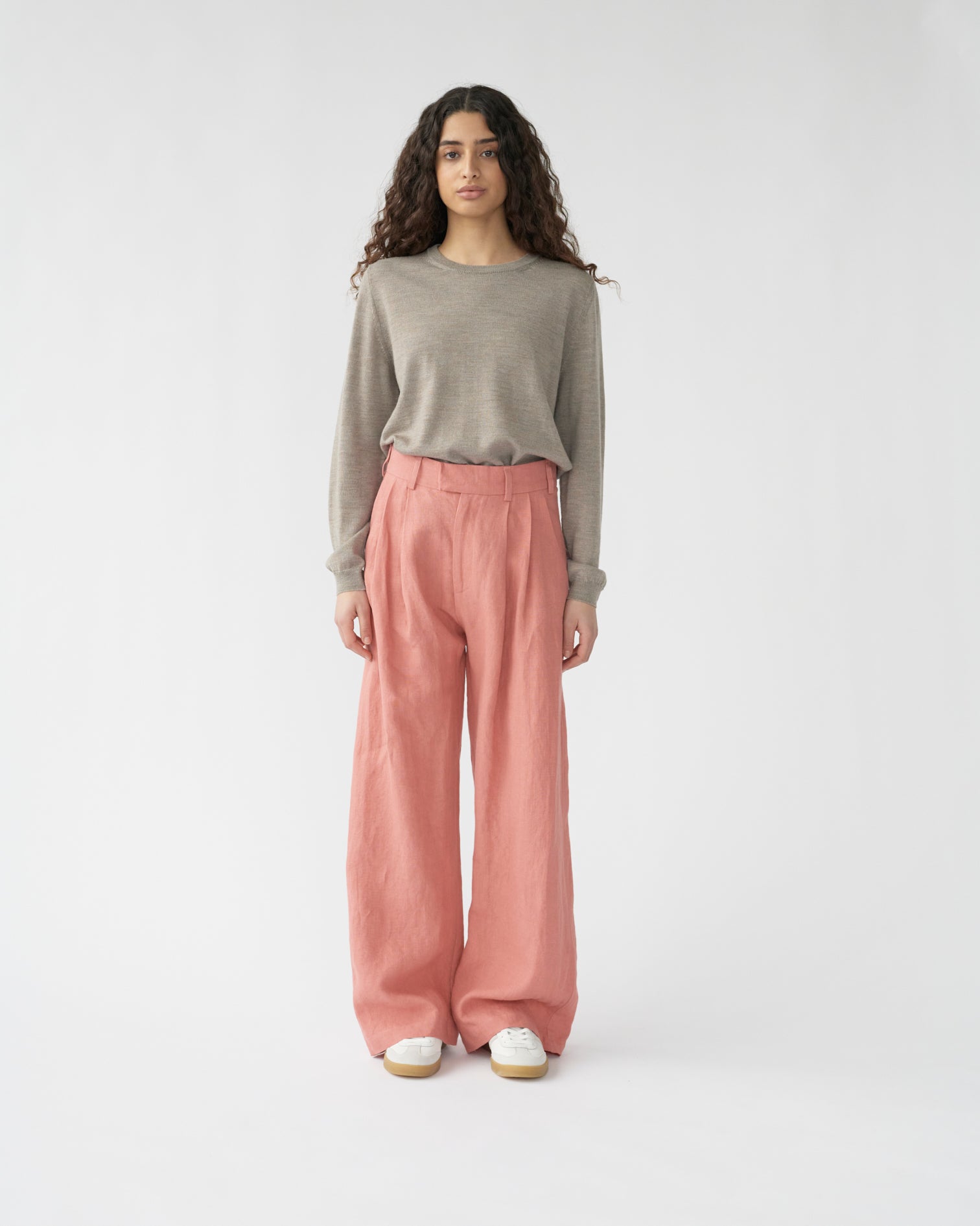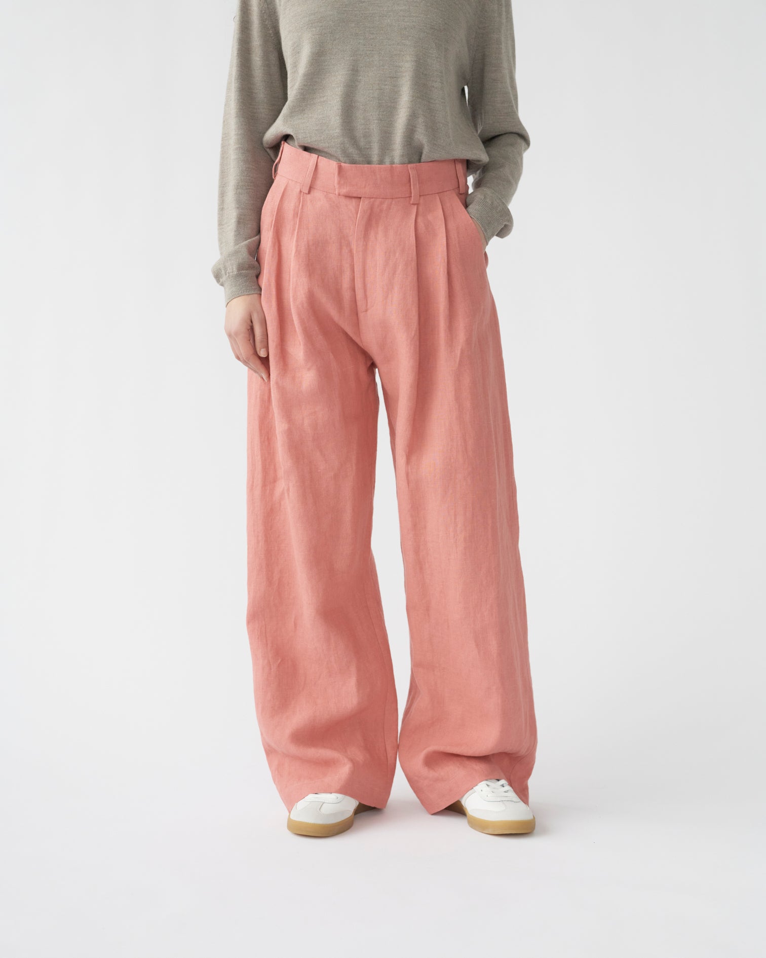 Oversized natural linen box trousers with an added pleat in each leg for a wider silhouette. Designed with two side pockets, one jetted back pocket, and a concealed hook-and-eye, horn button, and zip closure.