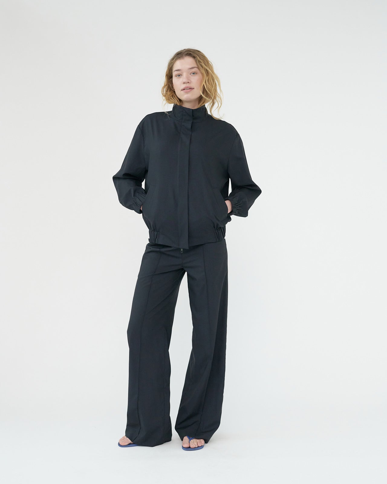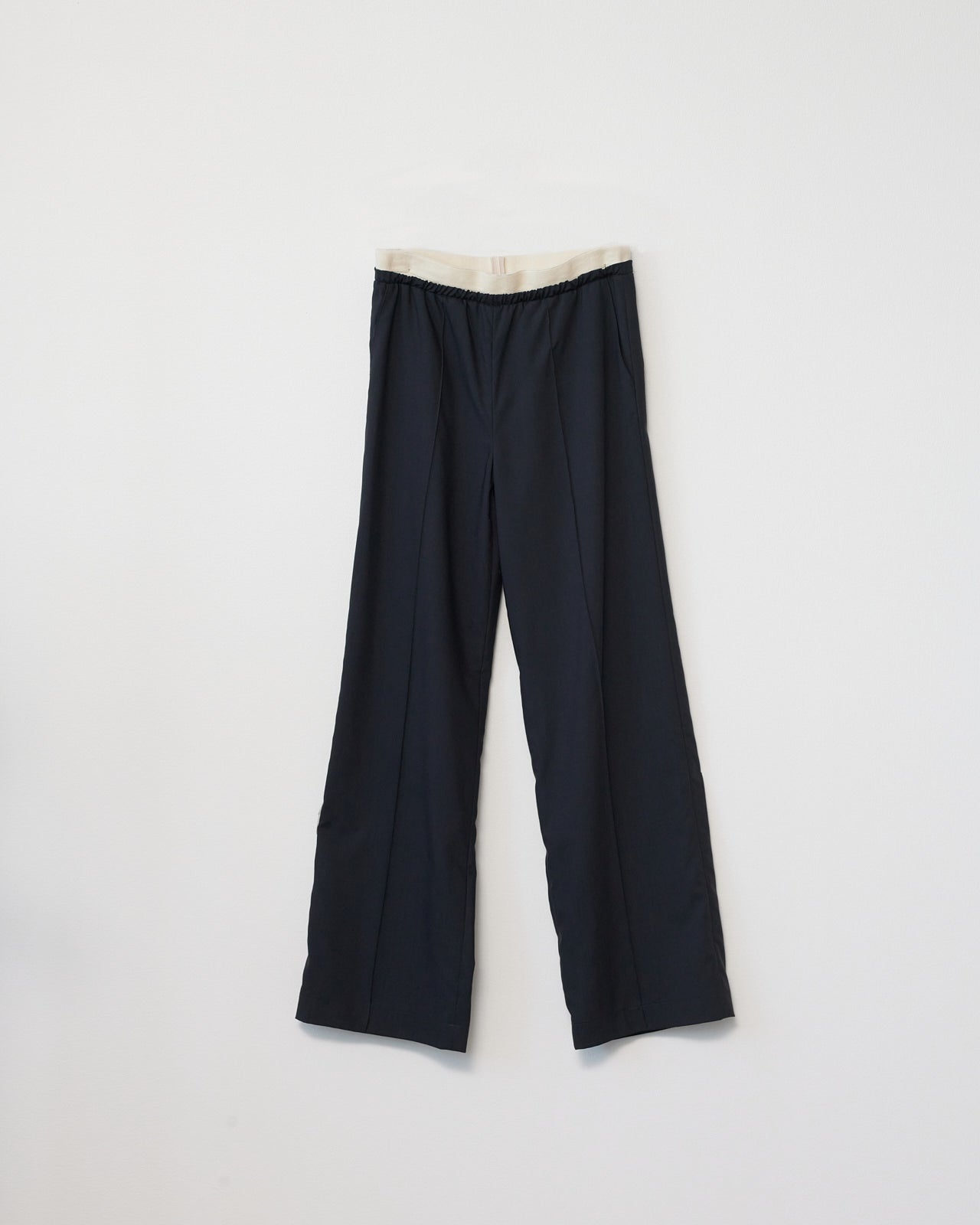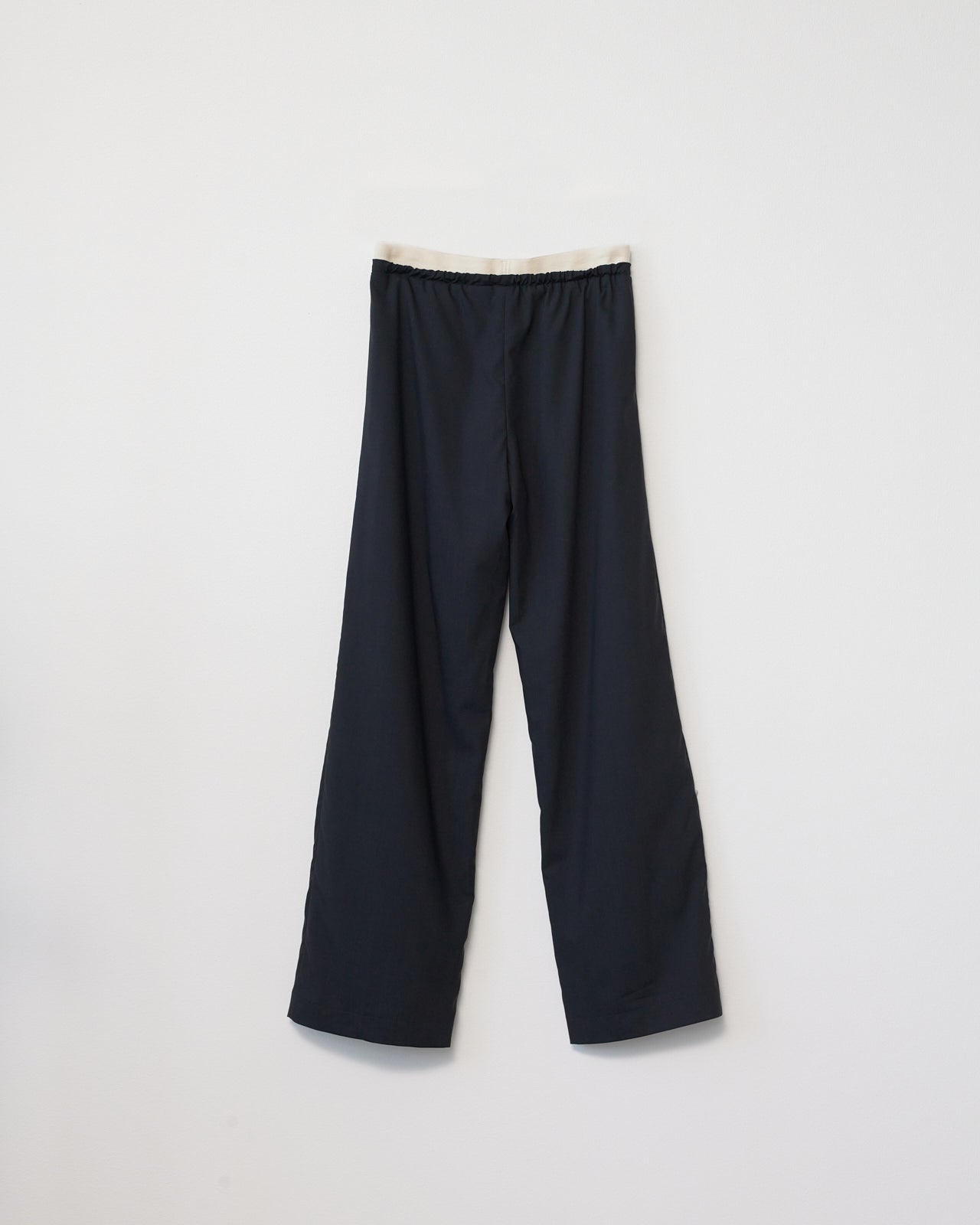 These trousers feature a wide white elastic waistband and pleated legs for a sporty look, crafted from smooth wool that drapes elegantly.