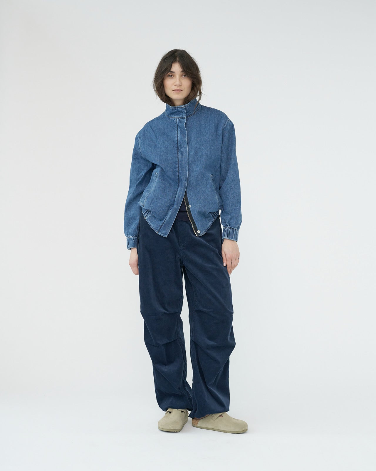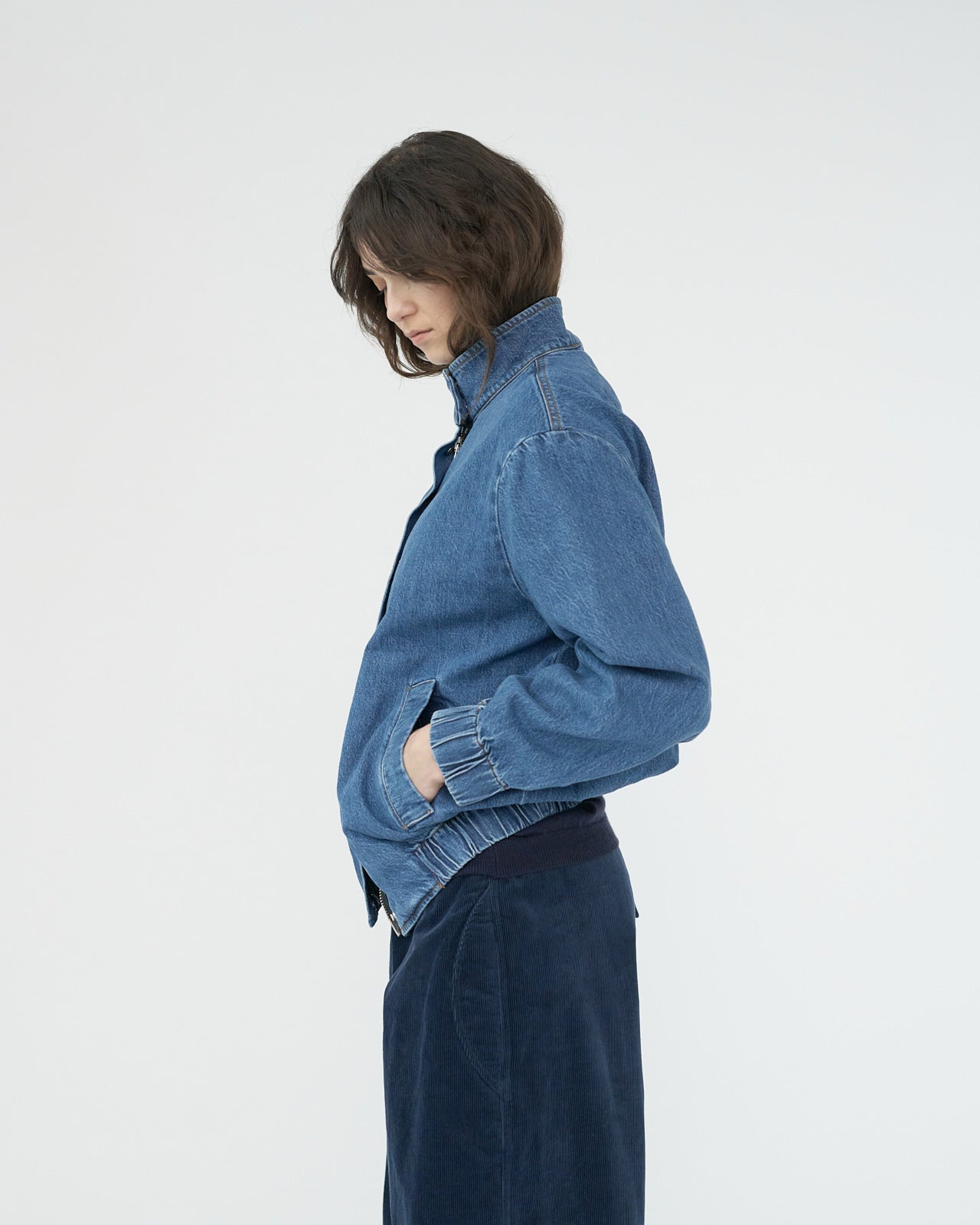 Hemp and cotton denim jacket with side pockets, a zip and button closure, and a wide elastic waistband.