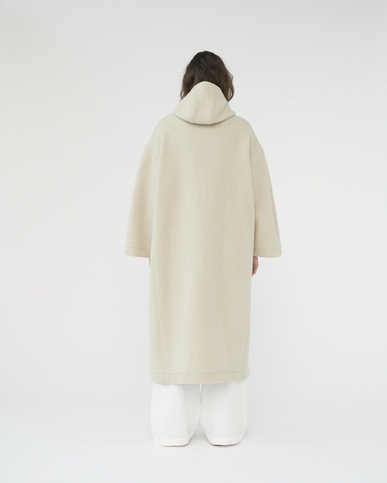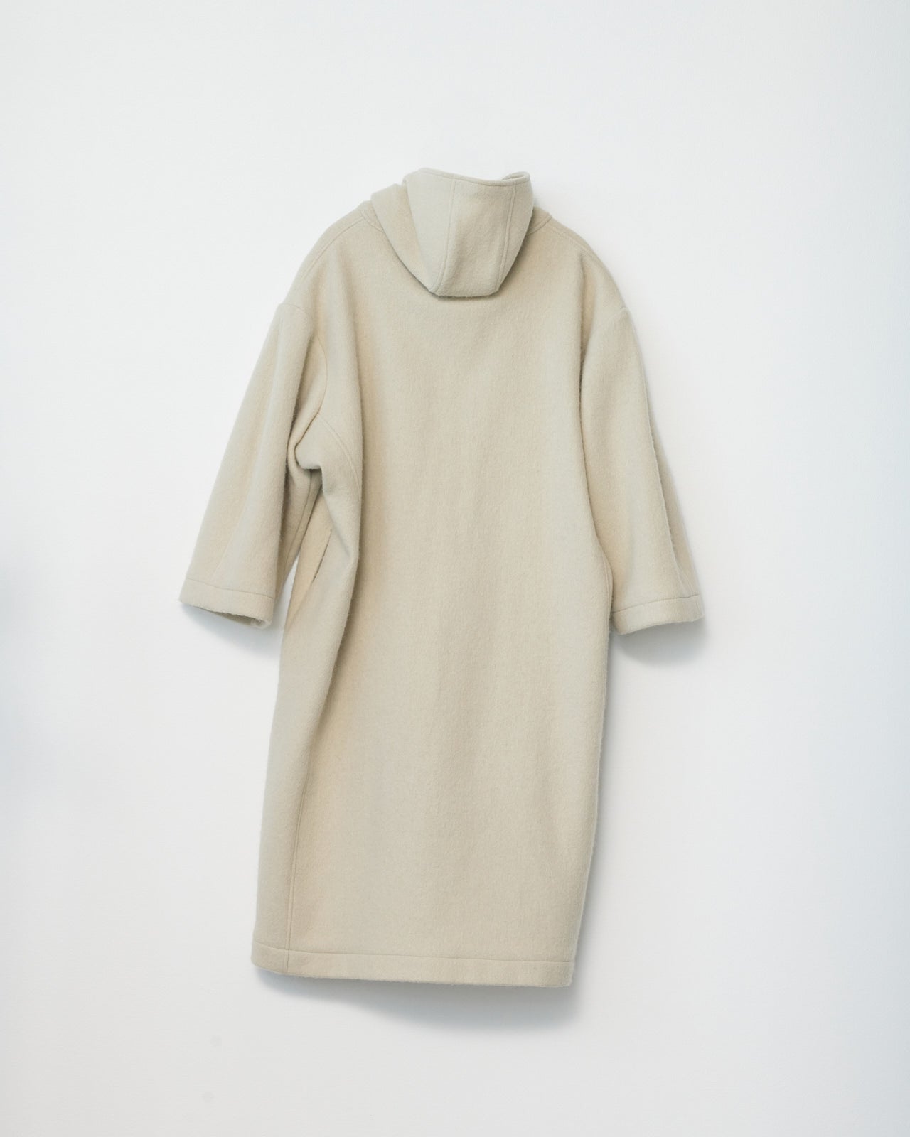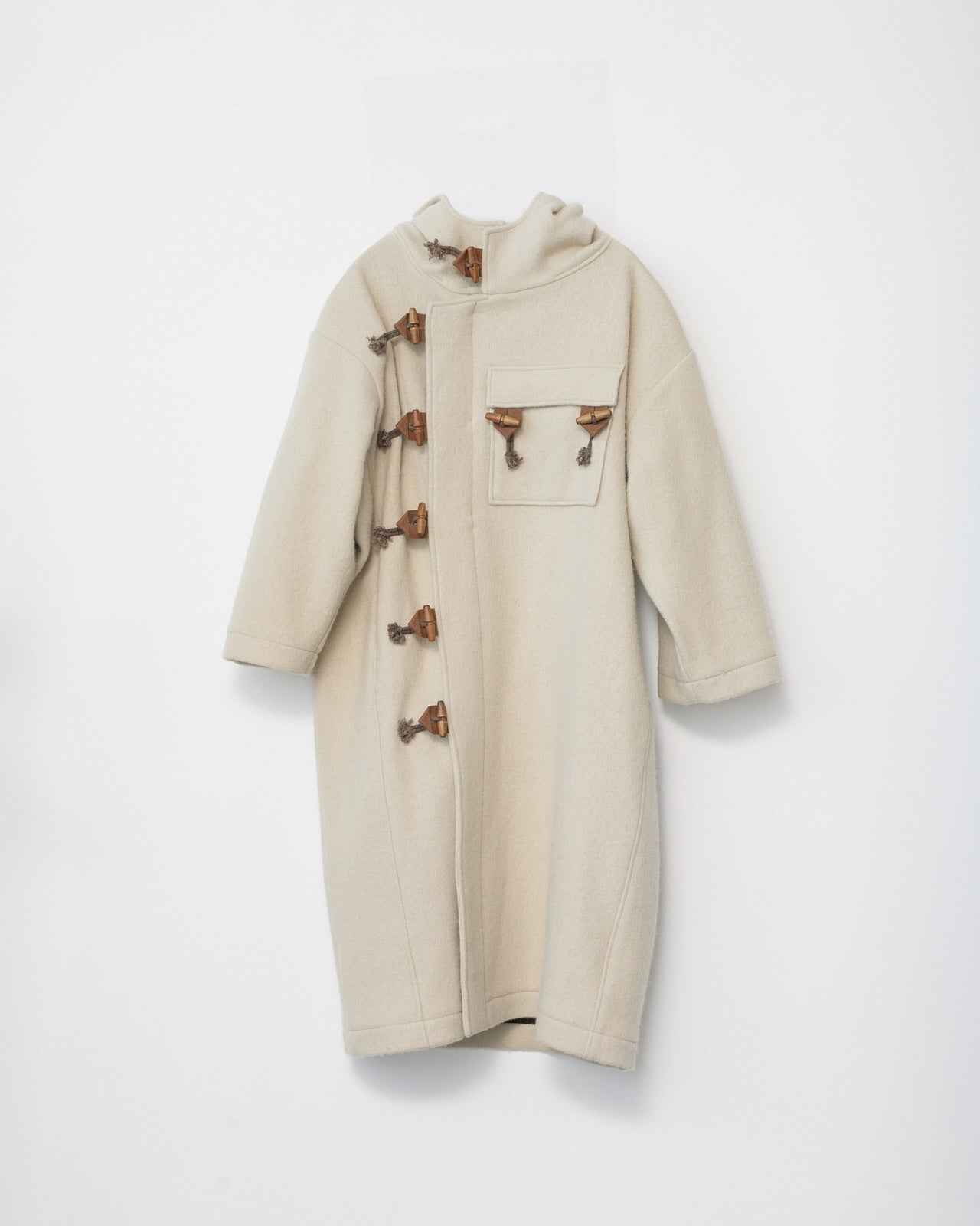 Klippan boiled wool duffle coat with a hood, asymmetrical wood toggles closure, a large front pocket and two side pockets.