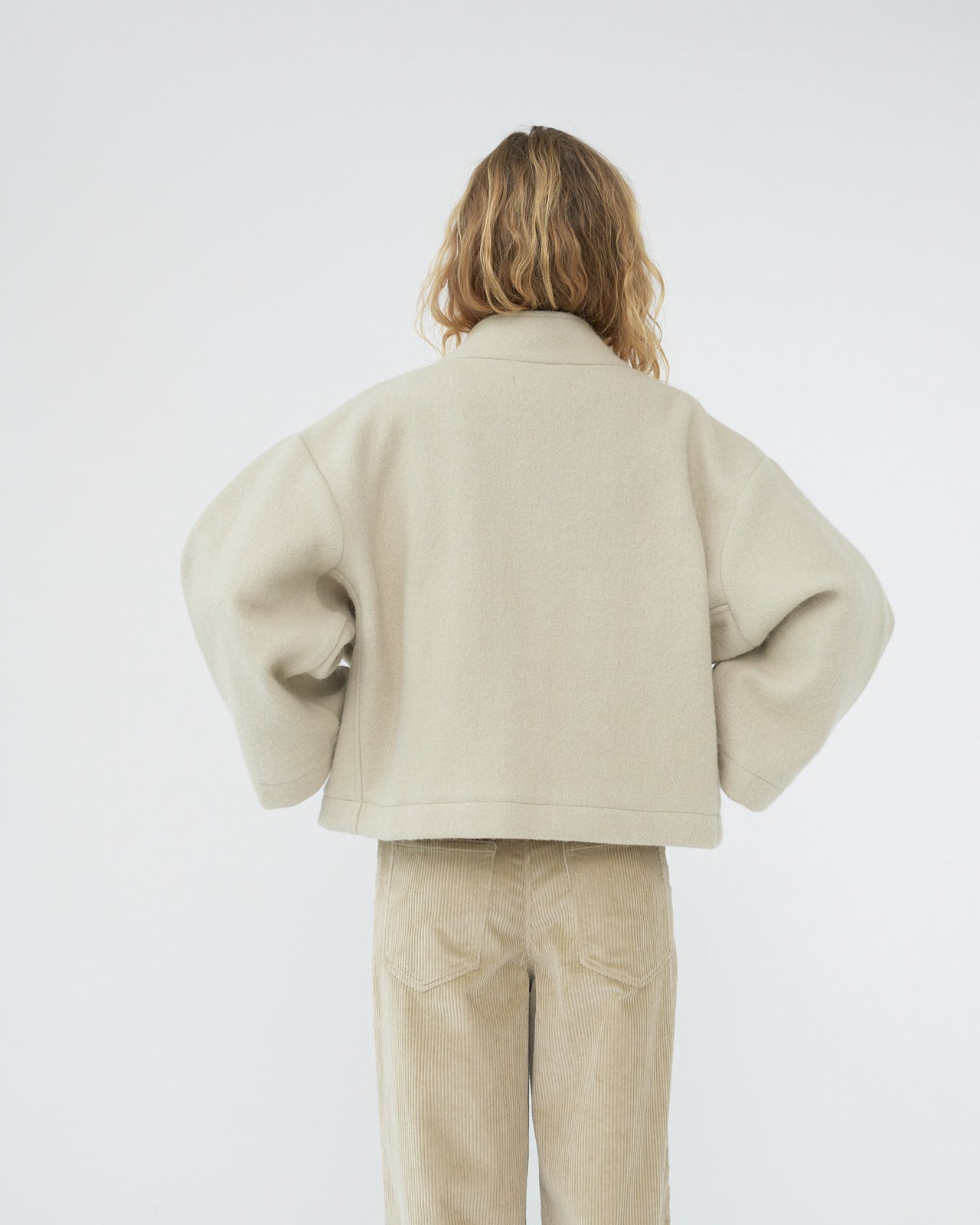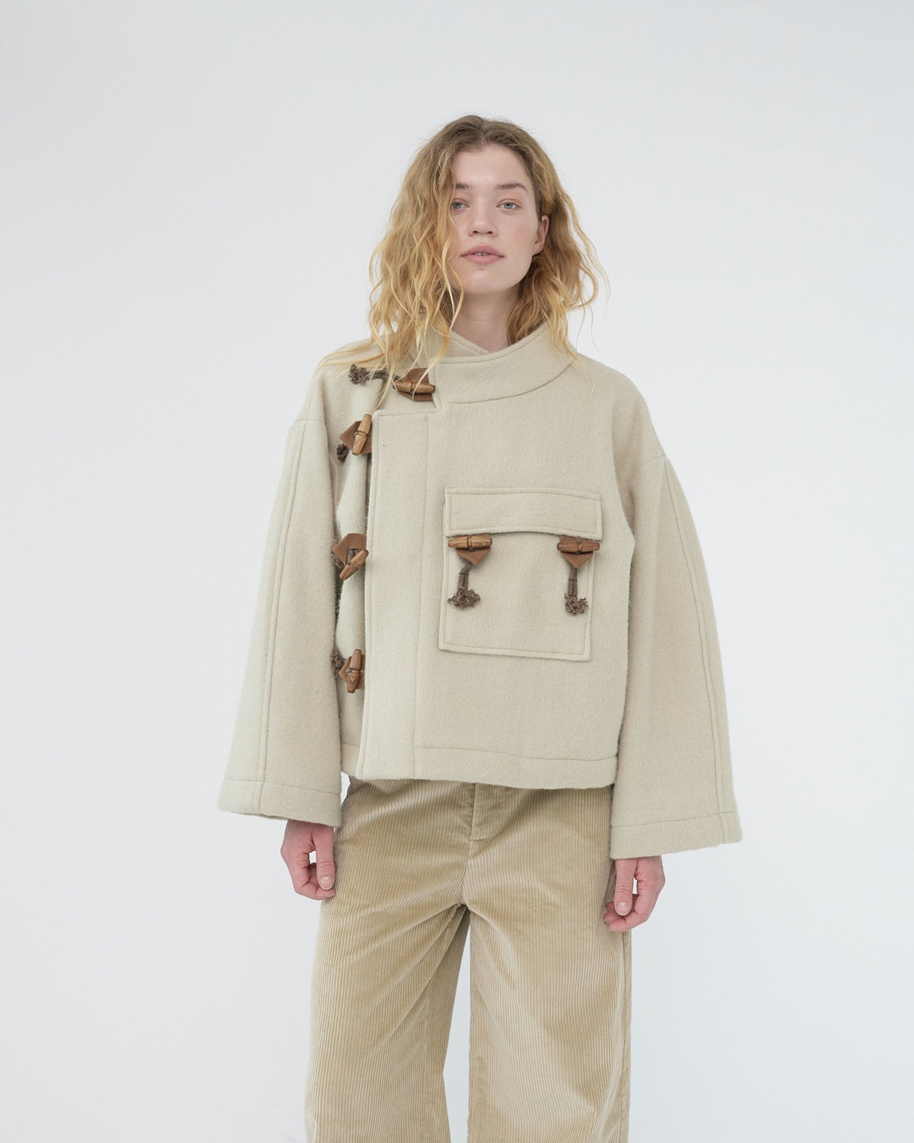 Klippan boiled wool jacket with asymmetrical wood toggles closure, a large front pocket and two side pockets.