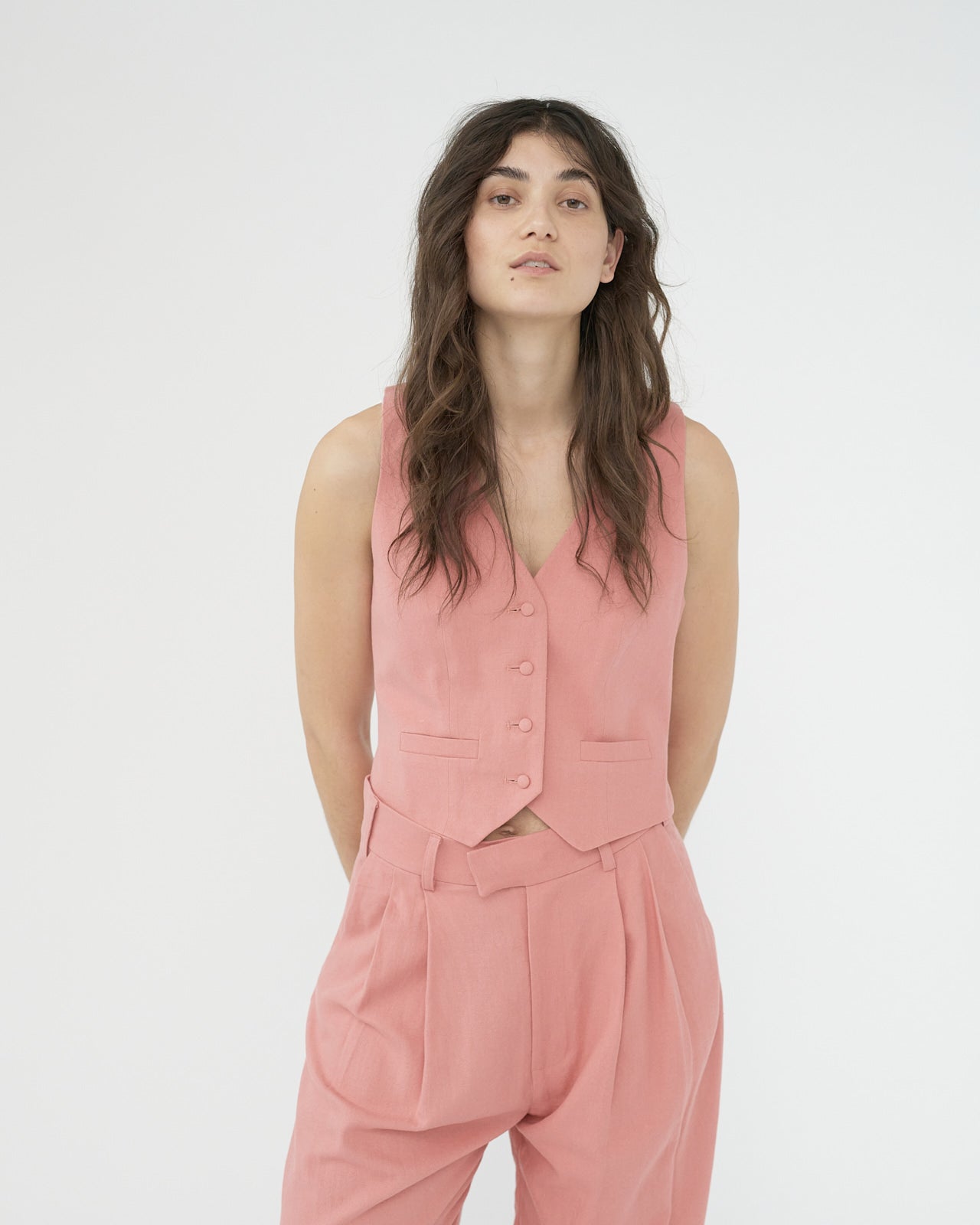 Fitted linen suit vest with a 4 button closure and strap detail in the back. Based on mens suit vest.